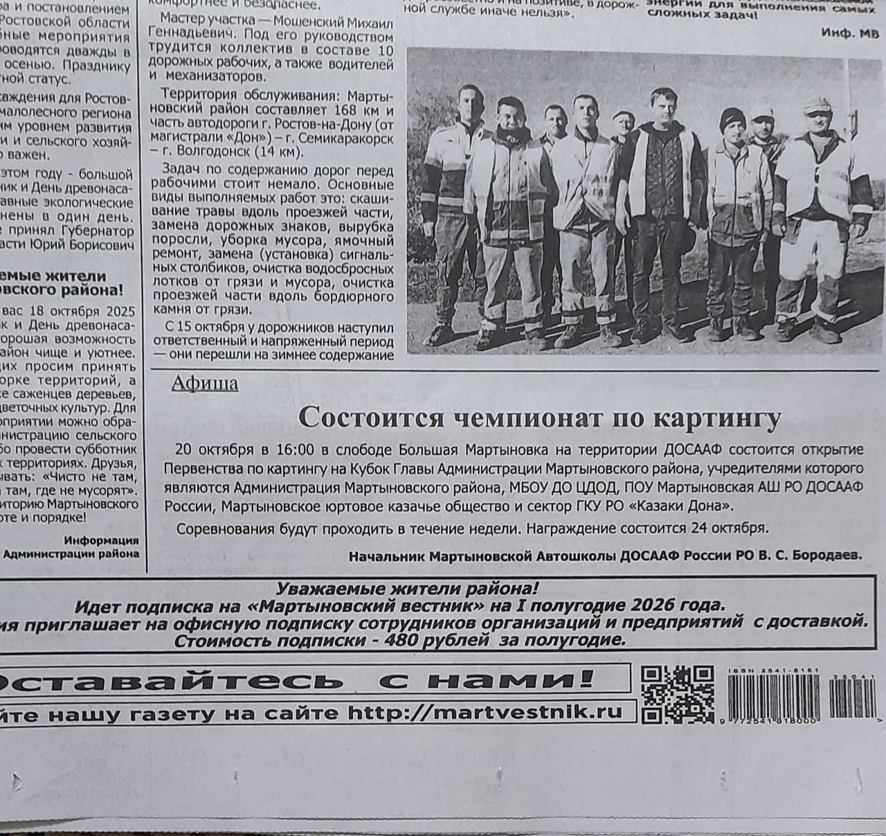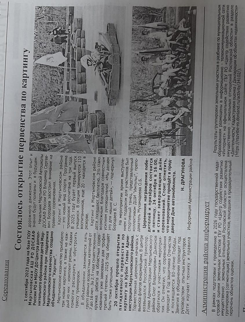 20 октября 2025 года на учебно- материальной базе ПОУ Мартыновская АШ РО ДОСААФ России РО прошло открытие пяти дневного первенство на кубок Главы Администрации Мартыновского района по картингу. Учредителями данного первенства были: Администрация Мартыновского района,МБОУ ДО ЦДОД, ПОУ Мартыновская АШ РО ДОСААФ России, Мартыновское юртовое казачье общество. Это мероприятие проводилось в рамках реализации программы « Поддержка казачьих обществ», направленной на воспитание у молодежи патриотизма и уважения к исторической памяти, воспитания национального самосознания и высоких духовных качеств, причастности к родному народу, к его истории и в соответствии с планом мероприятий, приуроченных году Защитника Отечества Российской Федерации. В честь открытия первенства по картингу, церемония началась с выноса флагов юнармейцами МБОУ СОШ №1 слобода Большая Мартыновка — Российской Федерации, Ростовской области, ДОСААФ России, казачества и движения первых.
